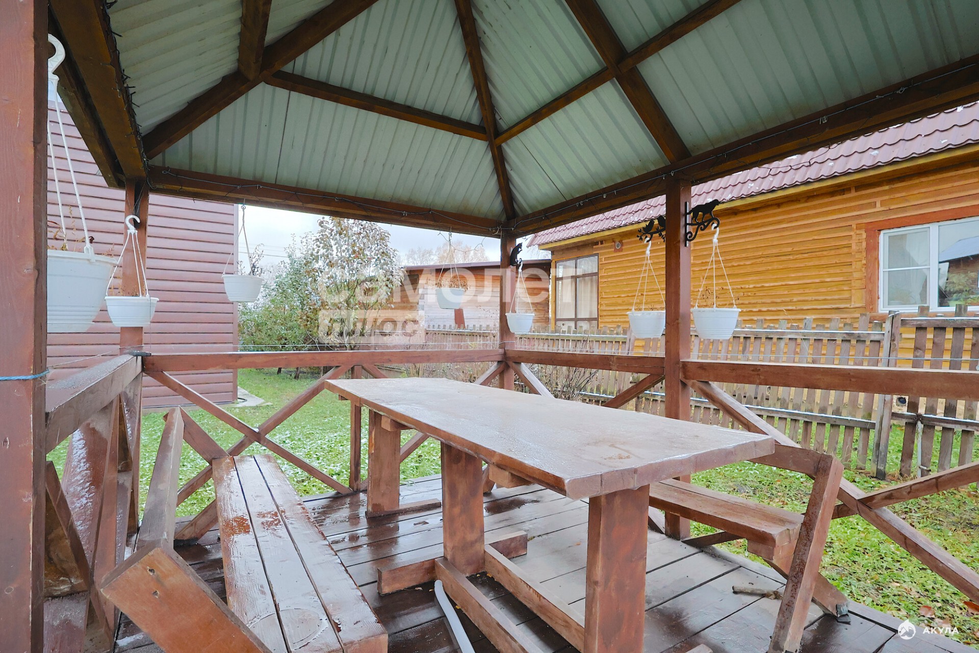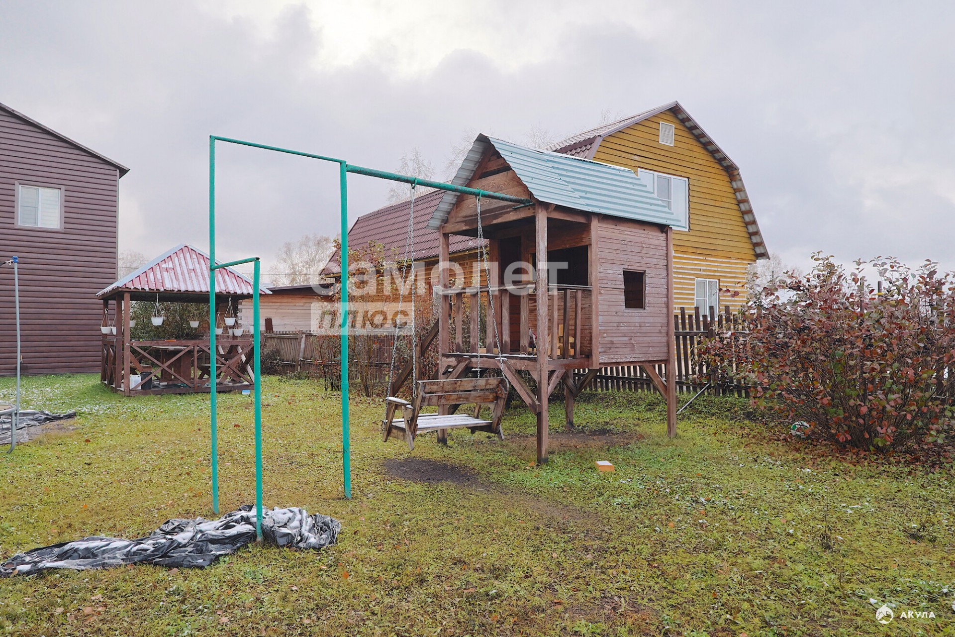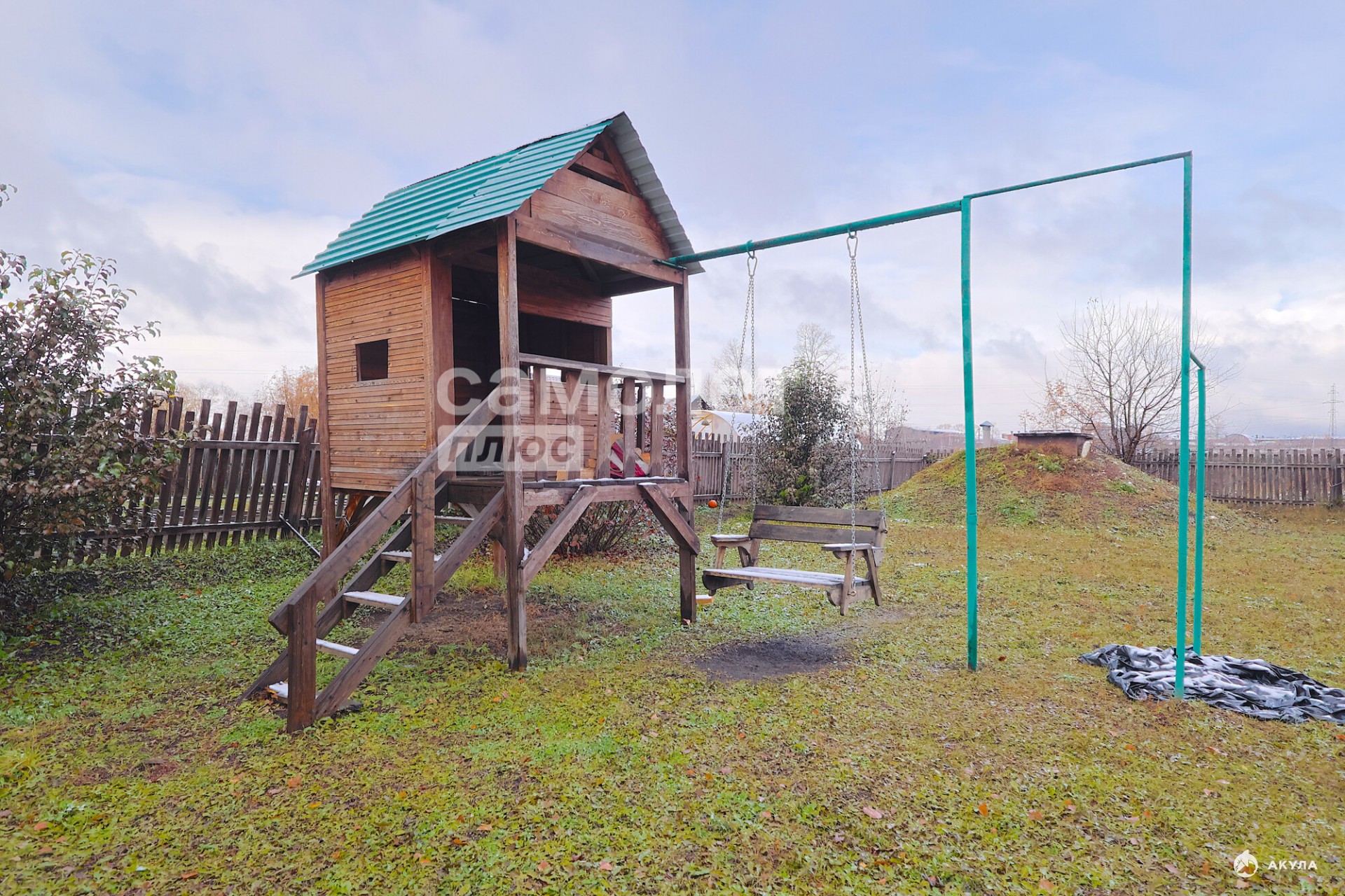 На территории есть: углярка, дровник, кладовая для инструментов, теплица, грядки, погреб, беседка, детская площадка: домик с турником и качелями, батут.