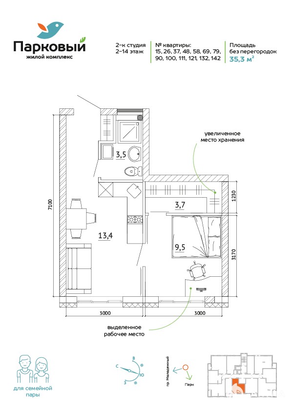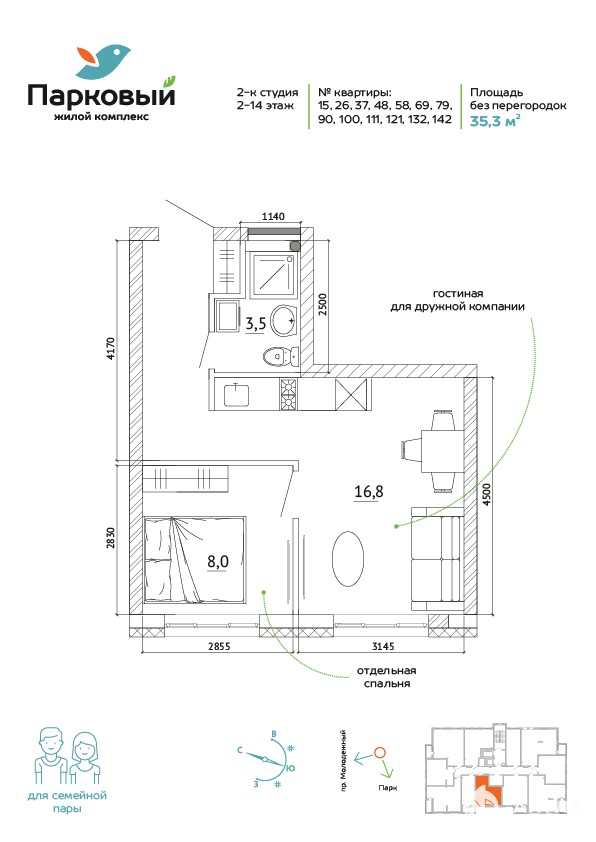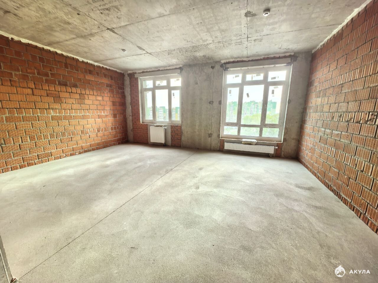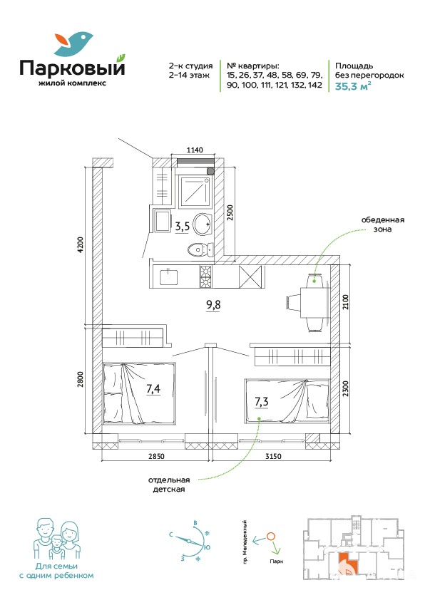 2 окна, очень удобно расположить отдельно спальную комнату и кухню-студию!