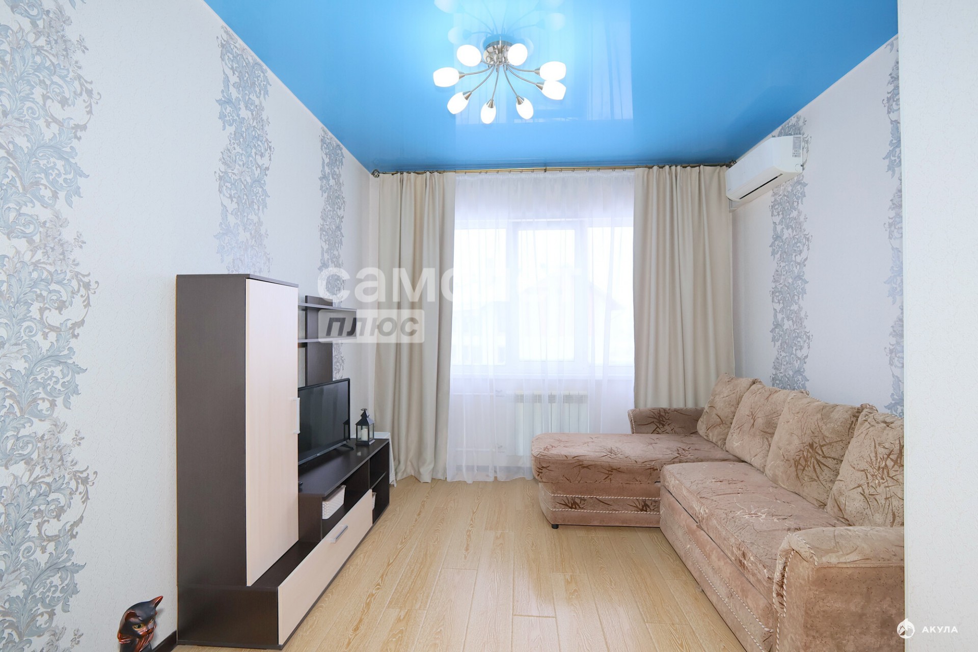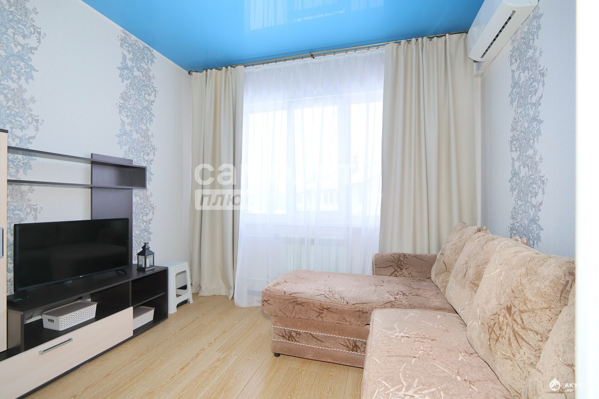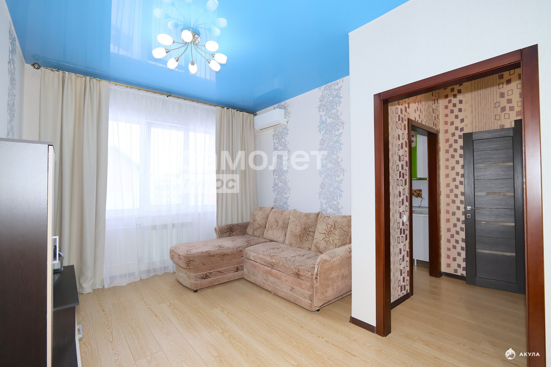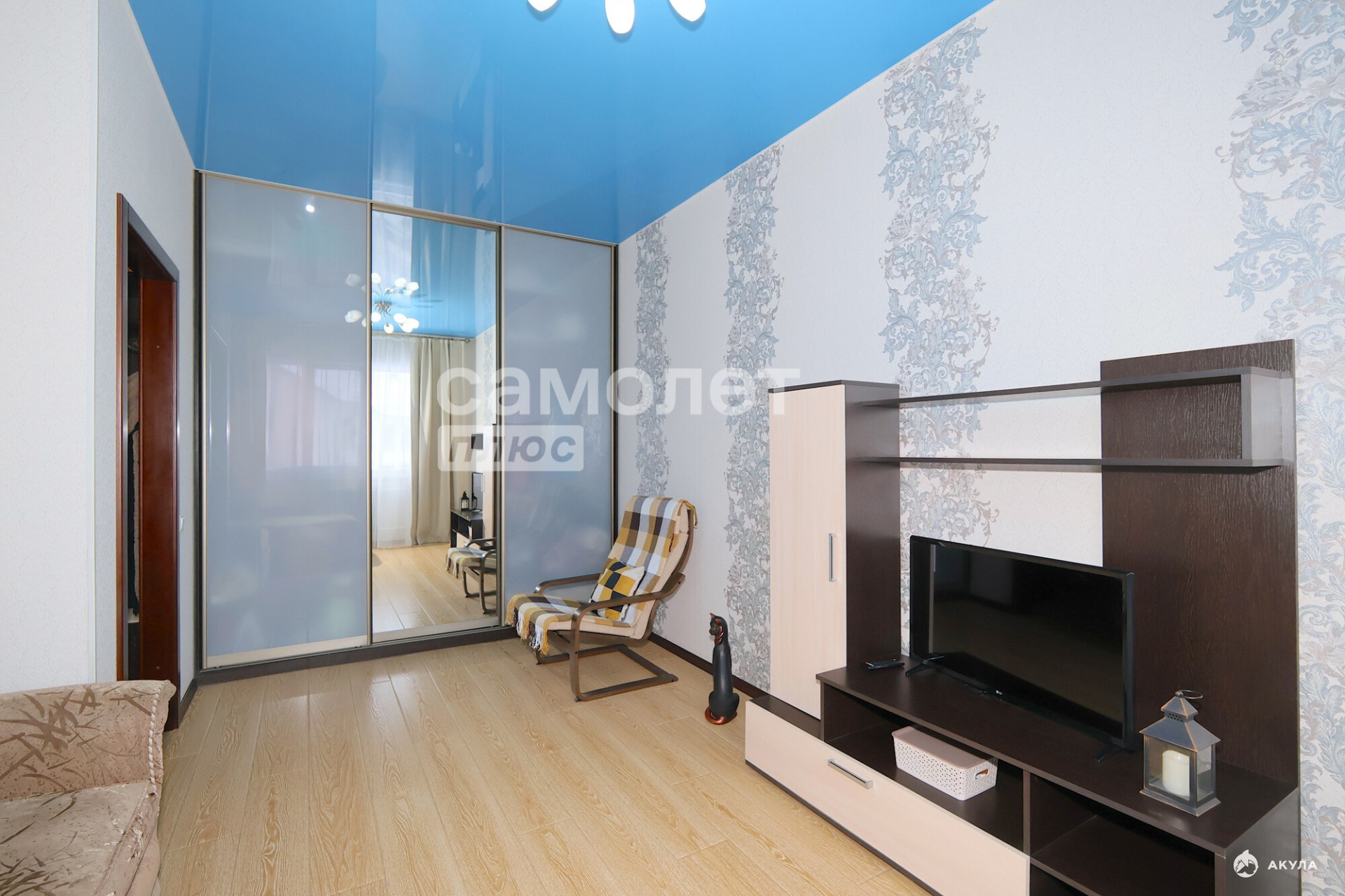- В гостинной находится большой, комфортный диван. Вместительный встроенный шкаф-купе и мебельная стенка под телевизор.