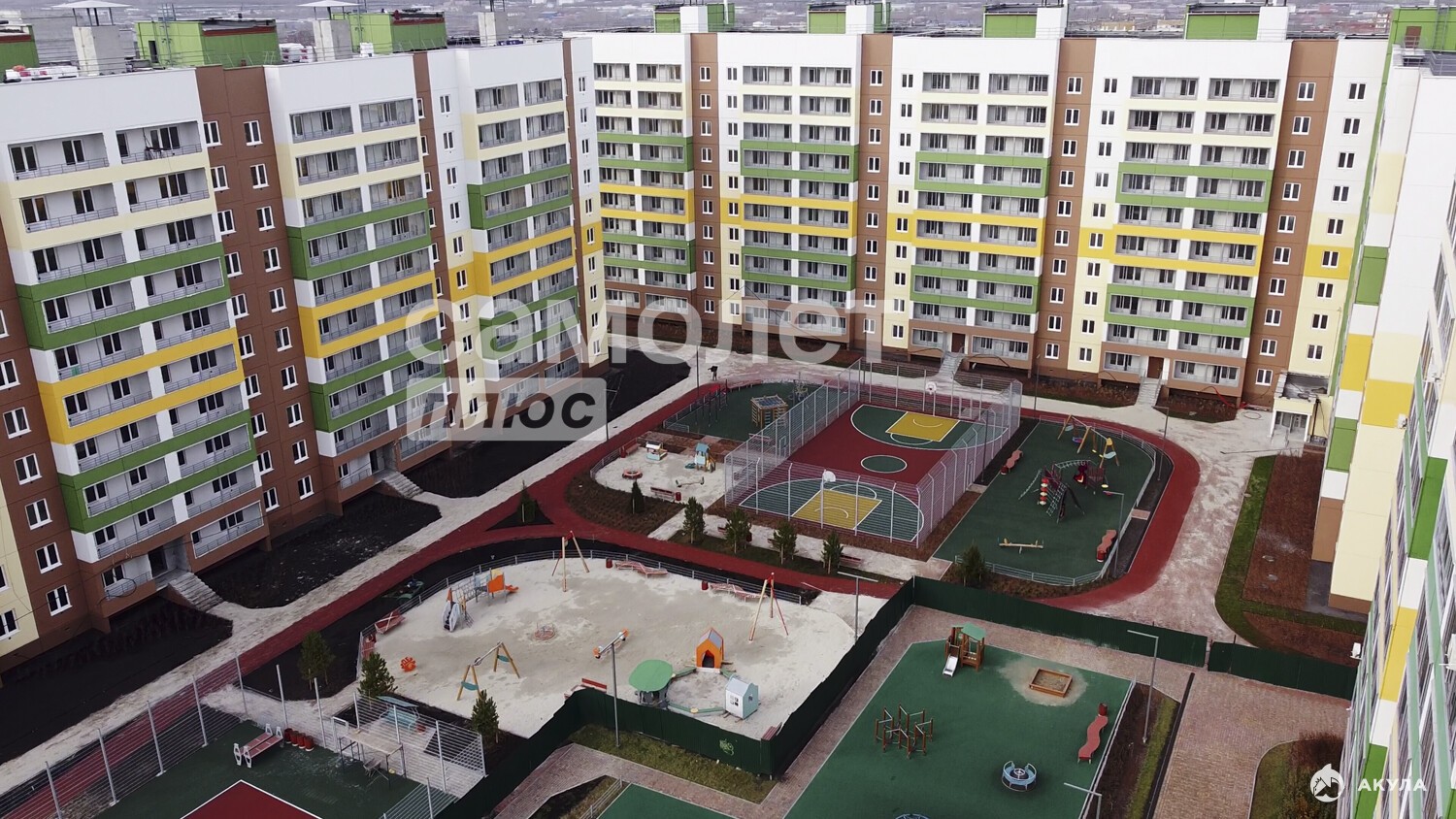 Комплекс из 5 домов по 10 этажей, ВНУТРЕННИЙ ДВОР оборудован детскими площадками. Также планируется строительство детского сада на территории комплекса;