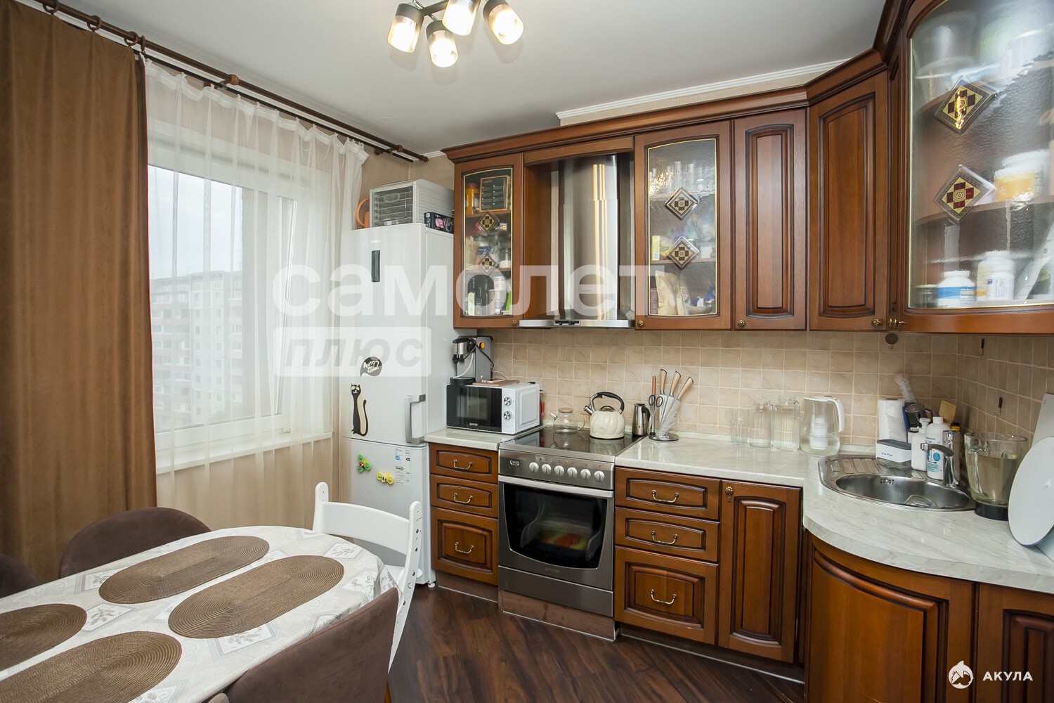 - кухня выполнена из массива дерева, укомплектованная всей необходимой техникой (остается новым собственникам) - холодильник, посудомоечная машина, плита, вытяжка,