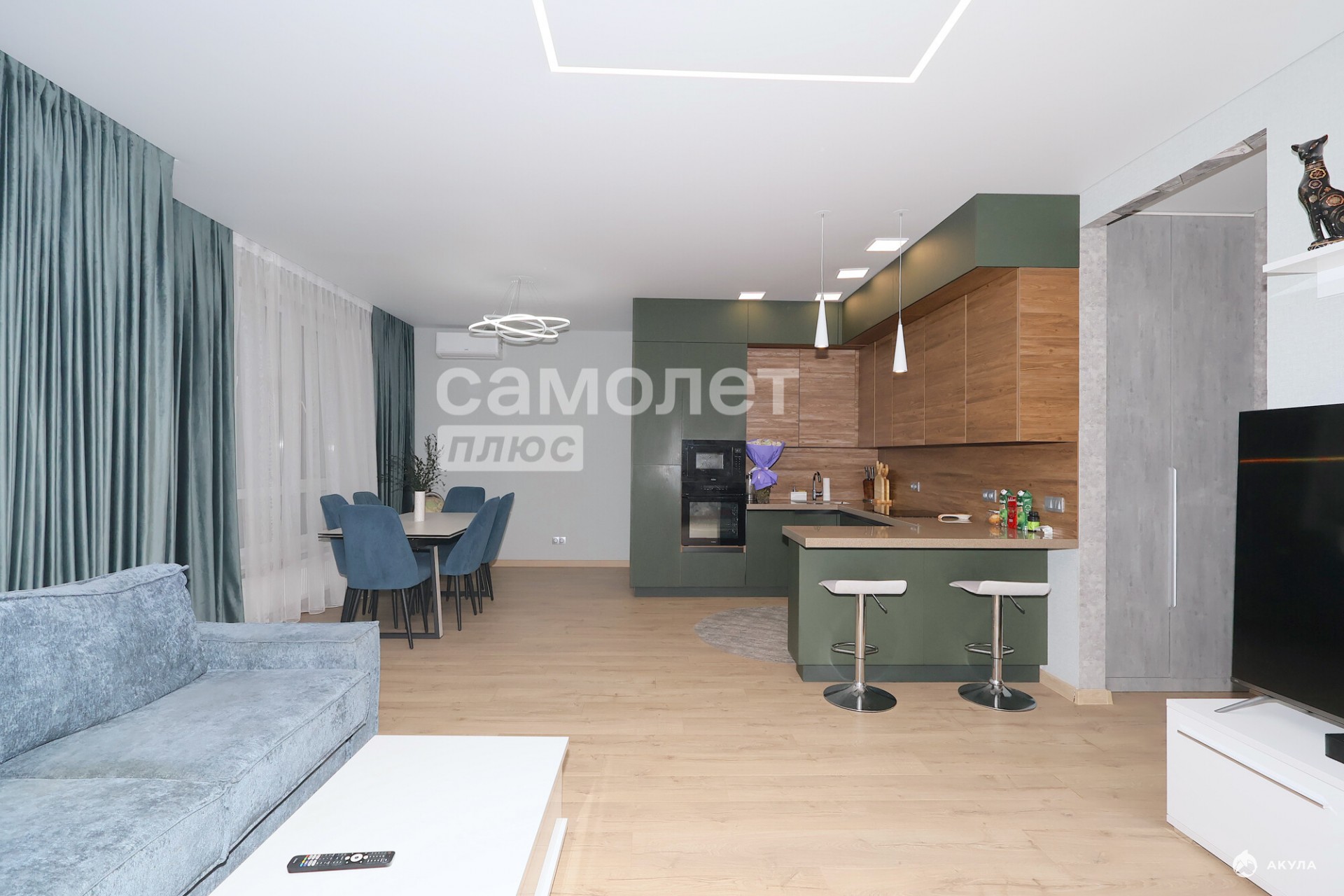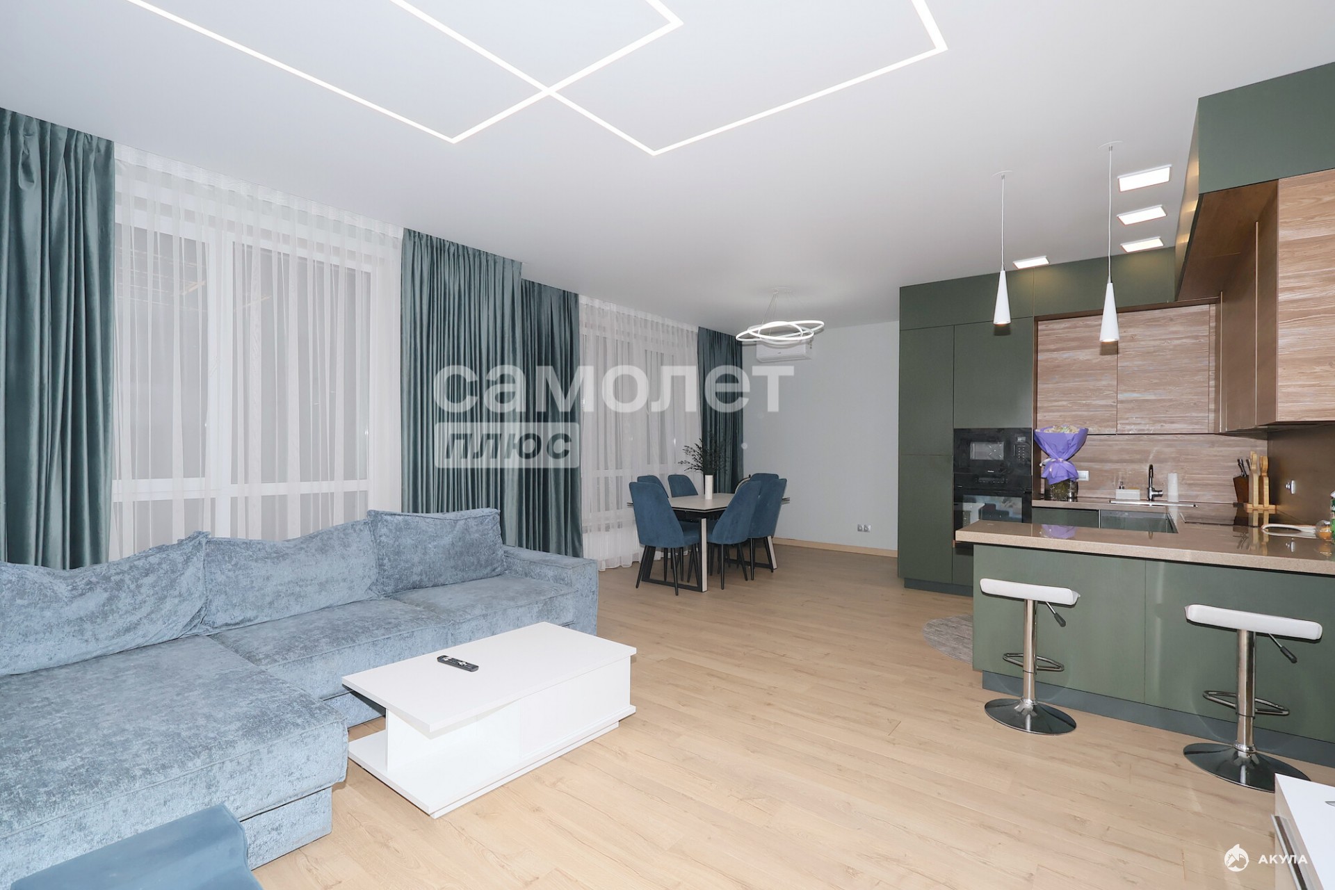 - Просторная кухня-гостиная 47, 4 м2. С просторной обеденной зоной и зоной отдыха. Кухонный гарнитур со встроенной техникой